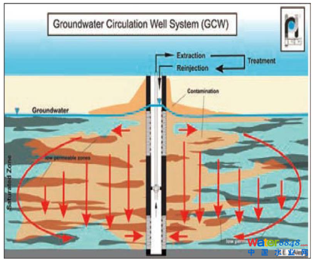 地下水循環(huán)井技術(shù)(Groundwater Circulation Well, GCW),又稱為井內(nèi)曝氣或井內(nèi)氣提法,是一種較先進(jìn)的原位修復(fù)技術(shù)。該技術(shù)通過抽水及回水動作產(chǎn)生地下水循環(huán),可與吹脫、空氣注入、氣相抽提、強(qiáng)化生物修復(fù)和化學(xué)氧化等多種技術(shù)結(jié)合,通過地下水的抽注循環(huán),在將地下水中溶解相污染物去除的同時,可對污染物的擴(kuò)散進(jìn)行有效控制,避免污染羽的進(jìn)一步擴(kuò)大。