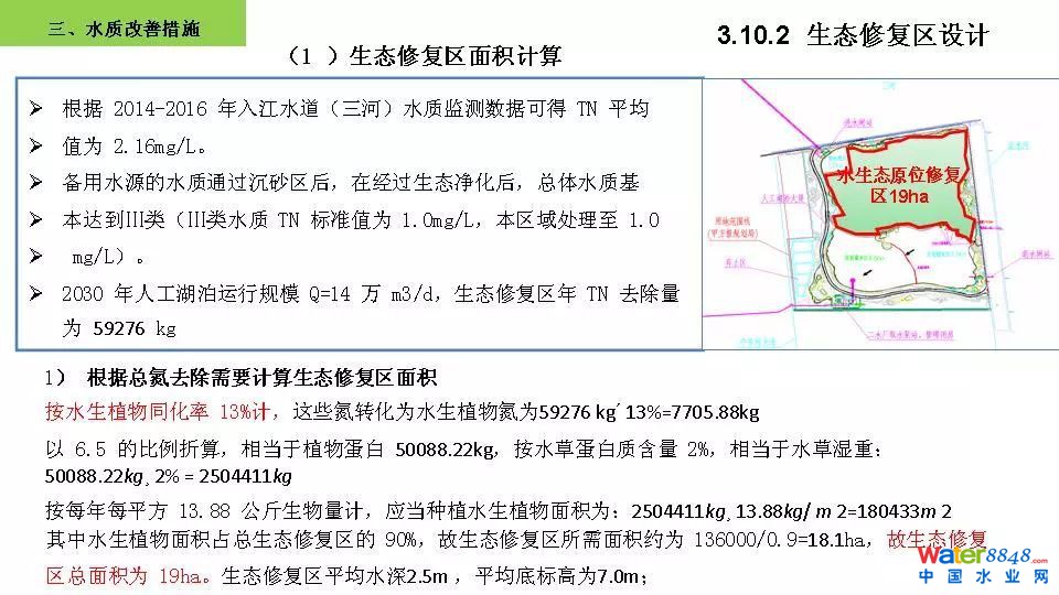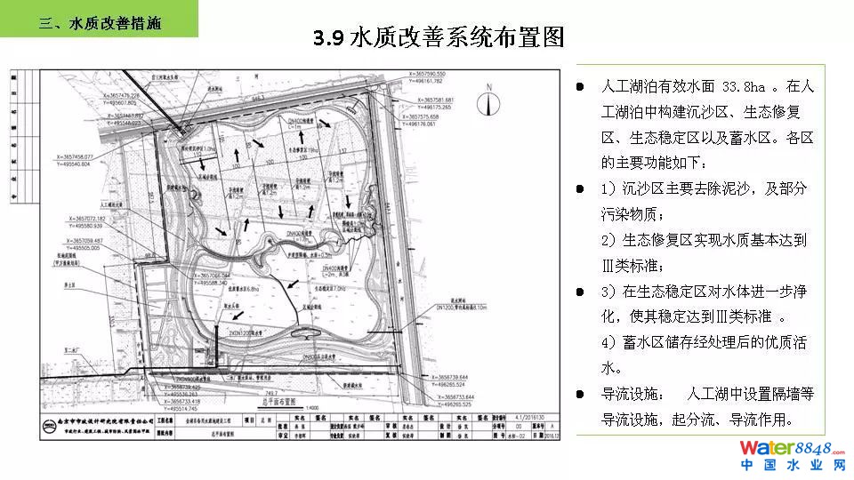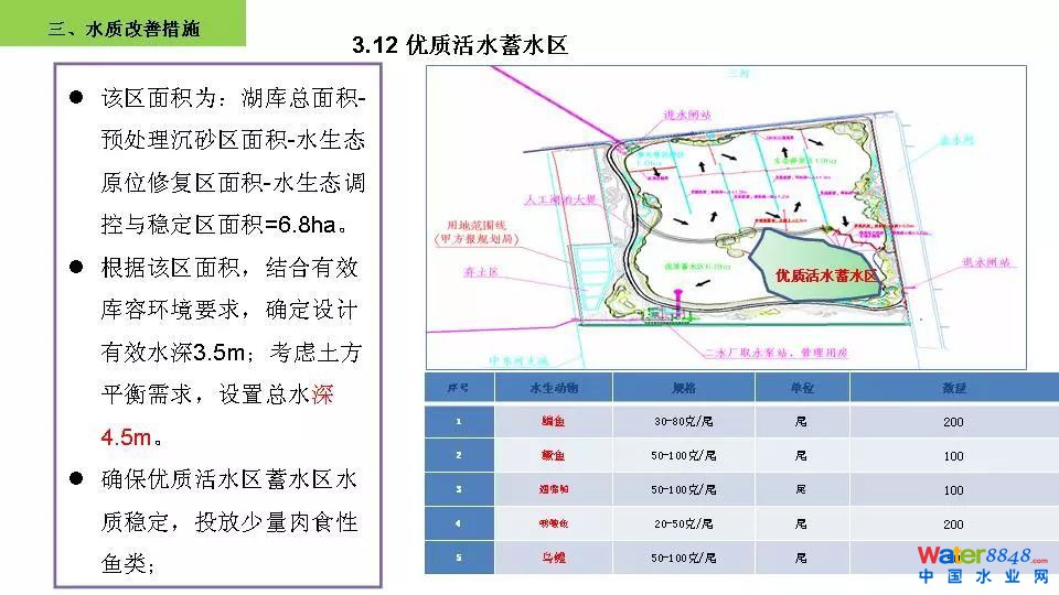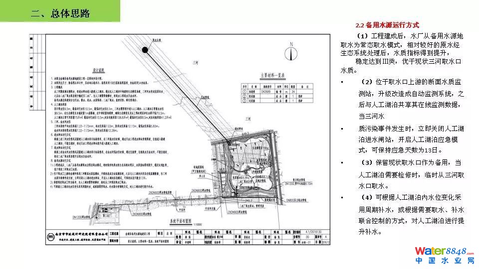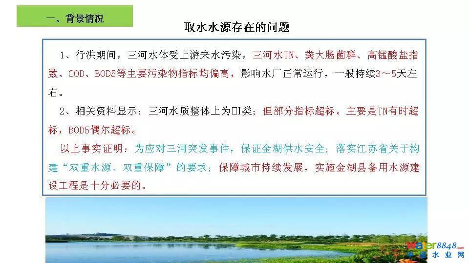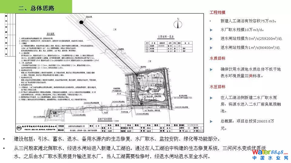 根據(jù)《淮安市水資源公報(bào)(2015年)》,2015年三河水質(zhì)狀況為Ⅲ類。但存在如下問題:行洪期間,三河水受上游來水污染,TN、糞大腸菌群、CODMn、BOD5等偏高,影響水廠正常運(yùn)行,一般持續(xù)3~5天左右;平時(shí)部分指標(biāo)超標(biāo)。為應(yīng)對(duì)三河突發(fā)事件,保證金湖供水安全,落實(shí)江蘇省關(guān)于構(gòu)建“雙重水源、雙重保障”的要求,保障城市持續(xù)發(fā)展,實(shí)施金湖縣備用水源建設(shè)工程是十分必要的。工程規(guī)模:新建人工湖泊有效容積75萬m3;水廠取水規(guī)模10萬m3/d;進(jìn)水閘站規(guī)模為3m³/s(259200m³/d);退水閘站規(guī)模為1m³/s(86400m³/d)。水質(zhì)目標(biāo):確保飲用水源地水質(zhì)總體不低于地表水環(huán)境質(zhì)量Ⅲ類標(biāo)準(zhǔn);水壓目標(biāo):在人工湖泊側(cè)新建二水廠取水泵房,將源水送入二水廠前臭氧接觸池。項(xiàng)目總投資為20603.8萬元。建設(shè)包括:引水、蓄水、退水、備用水源內(nèi)的生態(tài)修復(fù)、水廠取水、監(jiān)控安防、綠化等功能部分。報(bào)告分別從整體思路、水質(zhì)改善措施、管理維護(hù)措施、水質(zhì)改善技術(shù)等方面對(duì)該項(xiàng)目進(jìn)行了詳細(xì)介紹。