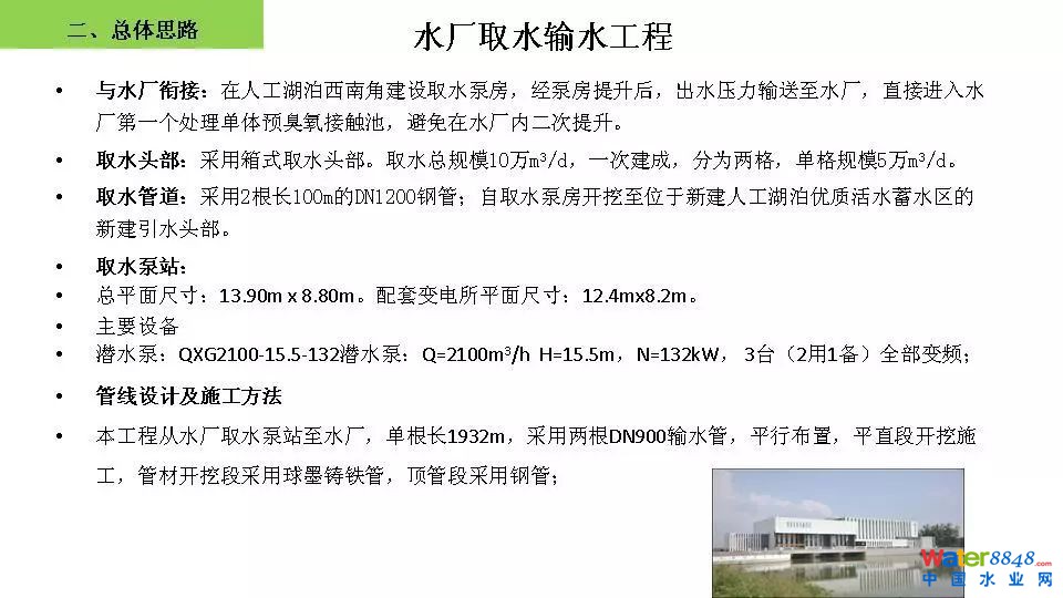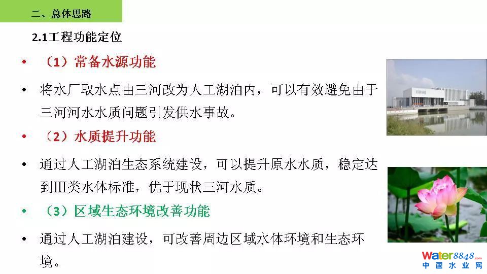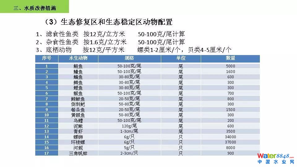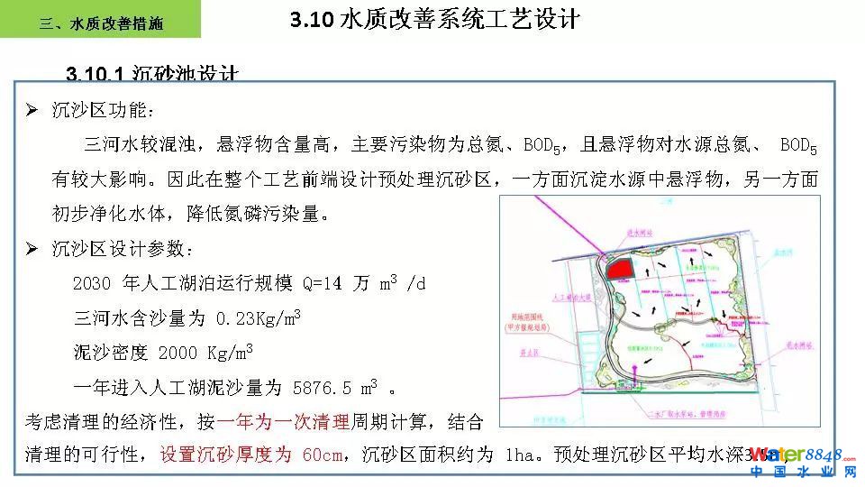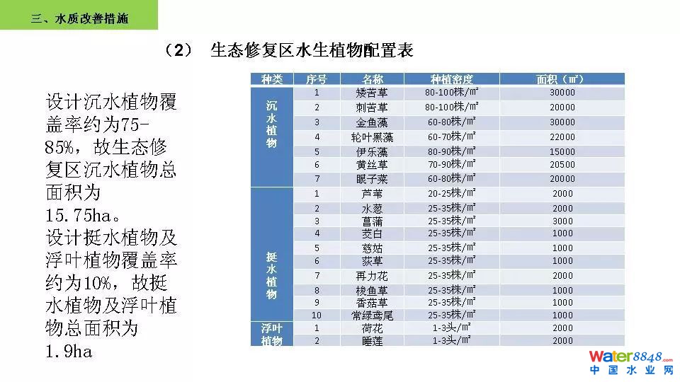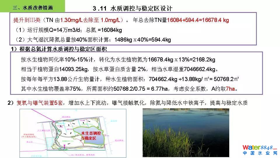 根據(jù)《淮安市水資源公報(bào)(2015年)》,2015年三河水質(zhì)狀況為Ⅲ類。但存在如下問題:行洪期間,三河水受上游來水污染,TN、糞大腸菌群、CODMn、BOD5等偏高,影響水廠正常運(yùn)行,一般持續(xù)3~5天左右;平時(shí)部分指標(biāo)超標(biāo)。為應(yīng)對(duì)三河突發(fā)事件,保證金湖供水安全,落實(shí)江蘇省關(guān)于構(gòu)建“雙重水源、雙重保障”的要求,保障城市持續(xù)發(fā)展,實(shí)施金湖縣備用水源建設(shè)工程是十分必要的。工程規(guī)模:新建人工湖泊有效容積75萬m3;水廠取水規(guī)模10萬m3/d;進(jìn)水閘站規(guī)模為3m³/s(259200m³/d);退水閘站規(guī)模為1m³/s(86400m³/d)。水質(zhì)目標(biāo):確保飲用水源地水質(zhì)總體不低于地表水環(huán)境質(zhì)量Ⅲ類標(biāo)準(zhǔn);水壓目標(biāo):在人工湖泊側(cè)新建二水廠取水泵房,將源水送入二水廠前臭氧接觸池。項(xiàng)目總投資為20603.8萬元。建設(shè)包括:引水、蓄水、退水、備用水源內(nèi)的生態(tài)修復(fù)、水廠取水、監(jiān)控安防、綠化等功能部分。報(bào)告分別從整體思路、水質(zhì)改善措施、管理維護(hù)措施、水質(zhì)改善技術(shù)等方面對(duì)該項(xiàng)目進(jìn)行了詳細(xì)介紹。