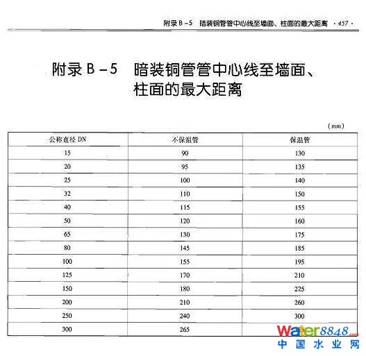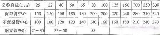 注:(1)鋼立管凈距指給水、采暖立管外壁與墻、柱的距離。(2)表中管中心與墻、柱的安裝距離使用于水平干管的安裝