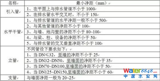 給水引入管管頂上部凈空一般不小于100mm排水排出管管頂上部凈空一般不小于150mm
