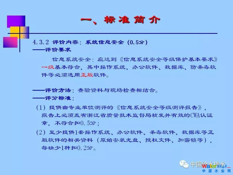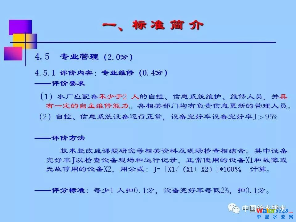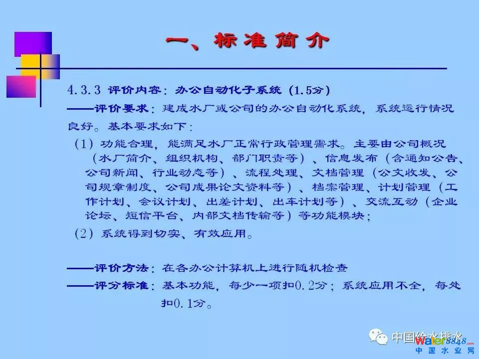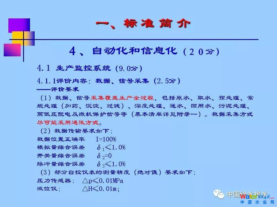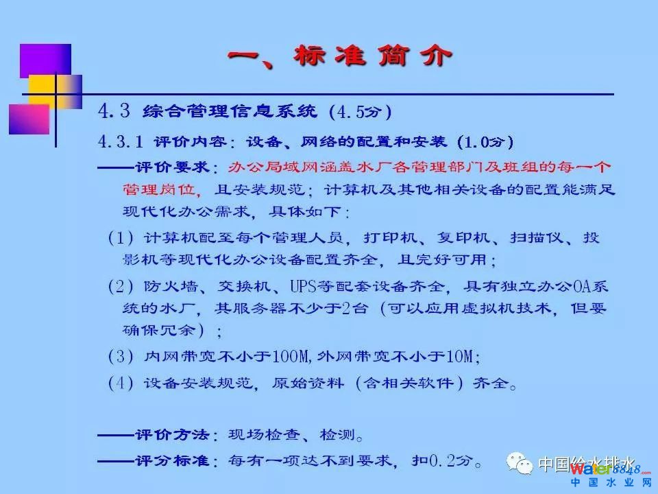 《浙江省城市供水現(xiàn)代化水廠評價標(biāo)準(zhǔn)》(2013版)涵蓋七大部分內(nèi)容:水質(zhì)、凈水工藝、電氣機(jī)械設(shè)備、自動化和信息化、科學(xué)管理、安全生產(chǎn)和水廠環(huán)境,共分為30多個評價類別、80多個評價項目、240多個評價點,評價總分為100分,其中,自動化和信息化占到20分。紹興市制水有限公司徐永燦副總經(jīng)理在報告中詳細(xì)介紹了“自動化和信息化”部分標(biāo)準(zhǔn)的具體評價內(nèi)容(評價要求、方法及評分標(biāo)準(zhǔn)),同時介紹了紹興制水有限公司建設(shè)現(xiàn)代化水廠的探索與實踐。
