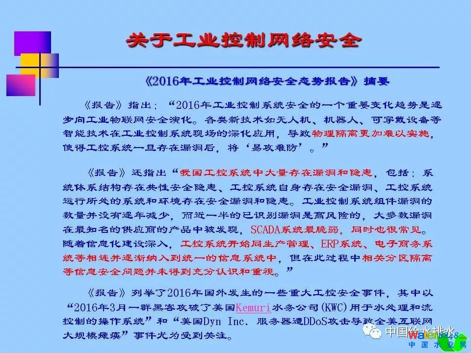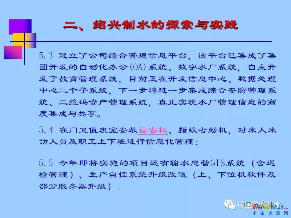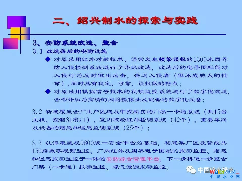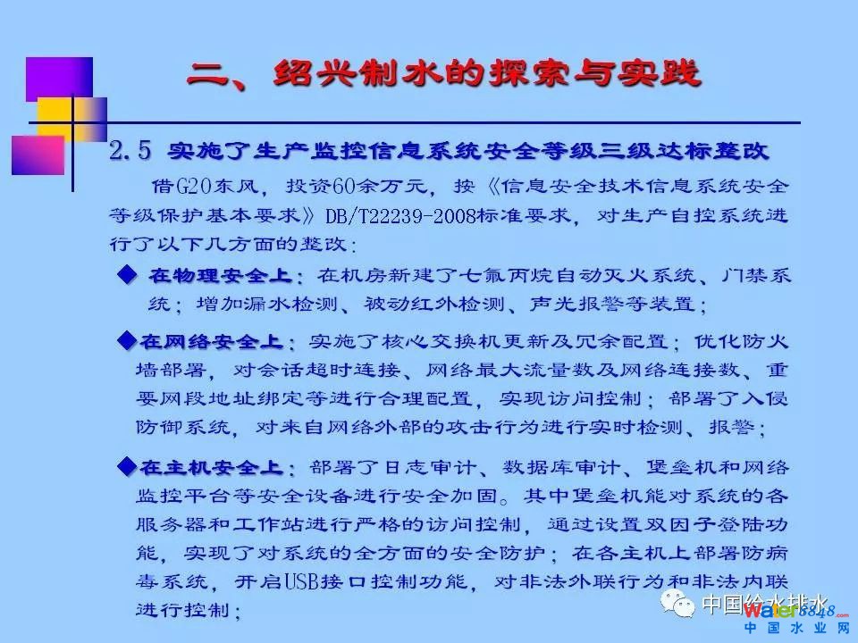 紹興市制水有限公司由宋六陵水廠、曹娥江水廠、平水江水廠組成,是面向紹興市越城區(qū)、柯橋區(qū)的供水企業(yè),服務(wù)面積1100平方公里,服務(wù)人口近200萬,其中宋六陵水廠是浙江省單體規(guī)模最大水廠、浙江省首家現(xiàn)代化水廠,該廠建設(shè)了覆蓋全廠的無線網(wǎng)絡(luò),實施了廠內(nèi)辦公局域網(wǎng)百兆升千兆的技術(shù)改造,同時利用VPN網(wǎng)絡(luò)技術(shù),進(jìn)一步將辦公網(wǎng)延伸至各輸水總管閥門站及原為應(yīng)急備用的西郭水廠(現(xiàn)為城市內(nèi)河供水),從而為公司推廣信息化管理奠定扎實的基礎(chǔ);探索性開發(fā)了水廠生產(chǎn)業(yè)務(wù)管理信息系統(tǒng)——數(shù)字水廠,主要包括巡檢管理、運行管理、水質(zhì)管理、設(shè)備管理等模塊;建立了公司綜合管理信息平臺,該平臺已集成了集團(tuán)開發(fā)的自動化辦公(OA)系統(tǒng)、數(shù)字水廠系統(tǒng),自主開發(fā)了教育管理系統(tǒng),目前正在開發(fā)信息中心、數(shù)據(jù)處理中心二個子系統(tǒng),下一步將進(jìn)一步集成綜合安防管理系統(tǒng)、二維碼資產(chǎn)管理系統(tǒng),真正實現(xiàn)水廠管理信息的高度集成與共享;借G20東風(fēng),投資60余萬元對水廠自控系統(tǒng)的信息安全進(jìn)行升級改造,達(dá)到了《信息安全技術(shù)信息系統(tǒng)安全等級保護(hù)基本要求》[GB/T22239-2008]標(biāo)準(zhǔn)中的三級標(biāo)準(zhǔn);投資100余萬元,完善了全廠建筑物及電子信息系統(tǒng)的防雷設(shè)施及全廠等電位接地系統(tǒng);在門衛(wèi)值班室安裝訪客機(jī)、指紋考勤機(jī),對來人來訪人員及職工上下班進(jìn)行信息化管理;2018年即將實施的項目還有輸水總管GIS系統(tǒng)(含巡檢管理)、生產(chǎn)自控系統(tǒng)升級改造(上、下位機(jī)軟件及部分服務(wù)器升級)。