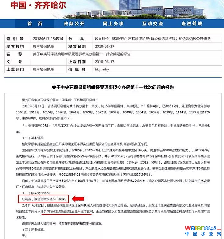 6月17日,齊齊哈爾市政府網(wǎng)發(fā)布反饋給中央環(huán)保督查組的情況說明,稱舉報(bào)情況不屬實(shí),污水經(jīng)處理后進(jìn)入城市管網(wǎng)。督查組供圖