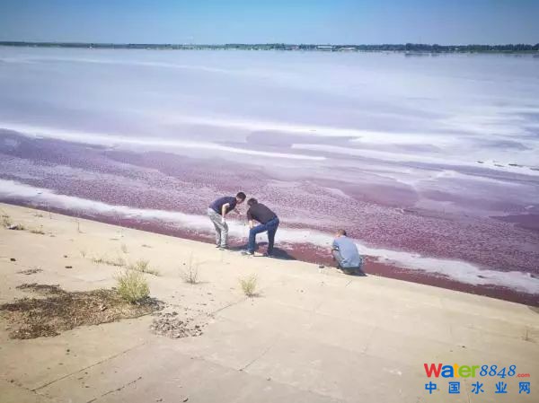 水面上漂浮著不明白色泡沫和結(jié)塊的紅色固體。人民網(wǎng)記者余璐攝