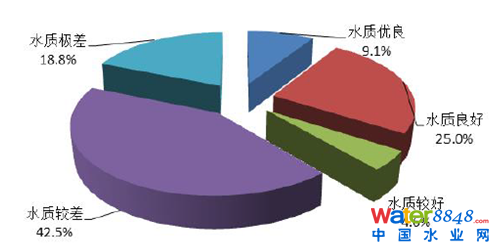 根據(jù)國(guó)家環(huán)保部發(fā)布的《2015 中國(guó)環(huán)境狀況公報(bào)》,長(zhǎng)江、黃河、珠江、松花江、淮河、海河、遼河等七大流域和浙閩片河流、西北諸河和西南諸河的國(guó)控?cái)嗝嬷校駘Ⅲ類、Ⅳ~Ⅴ類以及劣Ⅴ類水質(zhì)斷面比例分別為72.1%、19.0%和8.9%。