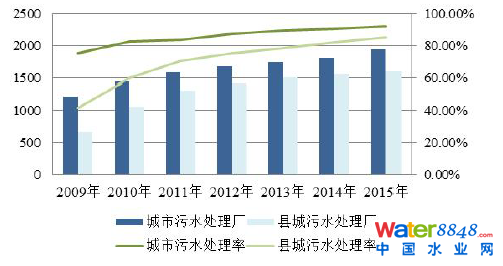 2009-2015 年,我國(guó)城市、縣城污水處理的變化情況如下: