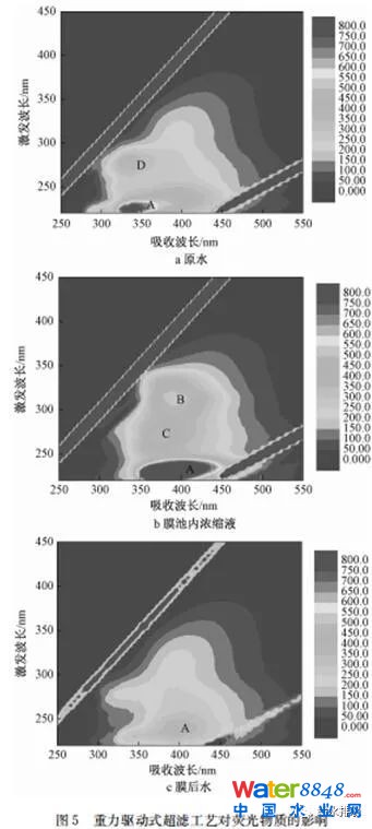 采用三維熒光光譜方法可以高效監(jiān)測水中不同類型的熒光有機物的遷移轉化規(guī)律。如圖5所示,通過定性分析,可以發(fā)現(xiàn),膜池中蛋白類有機物質含量有所增長,這是由蛋白類物質相對分子質量較高,被超濾截留后在膜池內累積造成的。另一方面,超濾膜膜后水的蛋白類和腐殖質類物質的濃度均大幅下降,只是在腐殖酸區(qū)域出現(xiàn)微弱的峰。這說明重力驅動式超濾工藝對于去除原水中有機物有較好的效果,可以有效保障出水水質。