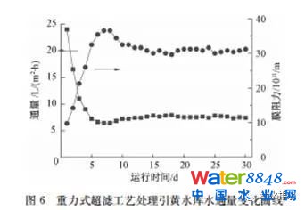 低壓重力驅動式超濾工藝作為一種新的超濾工藝運行方式,利用表面濾餅層中生物作用可以用以簡化超濾運行設備,降低物理和化學清洗產生的費用。另一方面,重力驅動式超濾工藝長期穩(wěn)定的運行說明針對引黃水庫水這一北方特殊水質,低壓重力驅動式超濾工藝具有很好的處理效果。