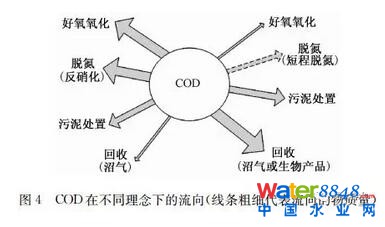 在傳統(tǒng)污水處理工藝中,COD的主要流向是被好氧分解,除此之外還用于脫氮除磷、厭氧消化及污泥處置。目前,污水中的碳已被廣泛認(rèn)為是可貴的資源,可以被用于產(chǎn)生能量(厭氧消化)、開發(fā)出以碳為基礎(chǔ)的商品。因此,污水中的可生物降解有機(jī)物從二級(jí)處理轉(zhuǎn)向能量回收的這一轉(zhuǎn)變被稱之為碳轉(zhuǎn)向,碳轉(zhuǎn)向是污水處理實(shí)現(xiàn)能量自給的必由之路,已經(jīng)成為當(dāng)前及今后一段時(shí)間內(nèi)污水處理技術(shù)發(fā)展的一個(gè)重要方向。圖4反映的是COD在新舊理念下的流向。