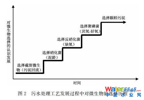 活性污泥工藝從誕生至今一直不斷經(jīng)歷著“選擇”的過(guò)程,早期的污泥回流使微生物選擇留在系統(tǒng)中,起到了最為關(guān)鍵的作用;此后,人們通過(guò)基本的長(zhǎng)泥齡方式而使硝化菌在系統(tǒng)中選擇地存在;而生物除磷工藝的出現(xiàn),則是通過(guò)厭氧-好氧的交替環(huán)境選擇性地使聚磷菌(PAOs)在系統(tǒng)中存在,可以看出對(duì)微生物的選擇過(guò)程一直伴隨著污水處理工藝的發(fā)展,如圖2所示。當(dāng)然,在這一系列的基本選擇過(guò)程中,還有其他因素的影響,比如硝化過(guò)程中對(duì)DO的需求、生物除磷過(guò)程對(duì)VFA的需求等。