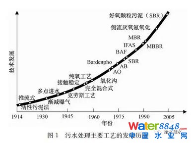 1914年,英國(guó)人Ardern、Lockett發(fā)明了活性污泥工藝,這一事件成為了現(xiàn)代污水發(fā)展的起點(diǎn)和重要的標(biāo)志性事件。自那以后,活性污泥工藝成為污水處理的主流處理技術(shù),圍繞著活性污泥工藝,污水處理技術(shù)獲得了長(zhǎng)足的發(fā)展,出現(xiàn)了百花齊放的技術(shù)格局。