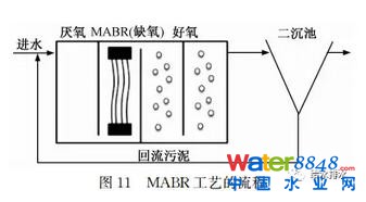 在具體應(yīng)用上,MABR工藝可以單獨(dú)使用,或是與傳統(tǒng)活性污泥工藝相結(jié)合,在曝氣池的前部設(shè)置厭氧區(qū)用于生物除磷,在中部位置放置MABR單元,其余部分仍然采用微孔曝氣的活性污泥工藝(如圖11所示),這樣懸浮污泥可以利用進(jìn)水中的碳源實(shí)現(xiàn)反硝化,而附著于MABR膜上的生物膜完成硝化過(guò)程,從而有效地避免了有機(jī)物與硝化對(duì)DO的競(jìng)爭(zhēng)問(wèn)題,這樣的工藝設(shè)置不僅節(jié)能還能大幅度降低池容。