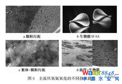 目前,國(guó)際上主流厭氧氨氧化的技術(shù)發(fā)展路線大致有四類:顆粒污泥、絮體+顆粒污泥、生物膜/IFAS以及懸浮+生物膜的形式形式,如圖6所示。
