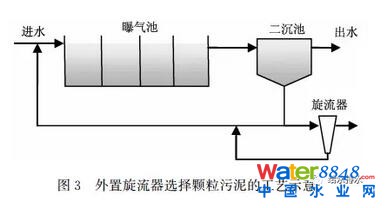 從好氧顆粒污泥的技術(shù)發(fā)展進(jìn)程來(lái)看,以Nereda為代表的好氧顆粒污泥技術(shù)實(shí)際上是一種利用內(nèi)在基質(zhì)選擇顆粒污泥的過(guò)程,內(nèi)在基質(zhì)選擇的一個(gè)關(guān)鍵因素是需要有足夠高的基質(zhì)濃度來(lái)形成顆粒,并促使形成較高含量的胞外聚合物(EPS)及胞內(nèi)儲(chǔ)存物,這種方式要求將沉淀較慢的絮體污泥排除系統(tǒng),保留下沉淀較快的顆粒污泥,為了避免出水SS較高,可能需要有一個(gè)后置的過(guò)濾系統(tǒng)。Nereda這種SBR的技術(shù)形式在很大程度上限制了對(duì)現(xiàn)有污水處理廠的改造,因?yàn)榻^大部分污水處理廠并不是SBR工藝。因此,在推流式工藝上采用外置選擇器的方式在近年來(lái)得到了快速的發(fā)展,外置選擇器可以是篩網(wǎng)或旋流器,篩網(wǎng)是利用顆粒的粒徑來(lái)截留較大的顆粒污泥,旋流器是利用顆粒污泥密度較大的特點(diǎn)而在底流中獲得較高比例的顆粒污泥,如圖3所示。