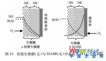MABR工藝的另外一個(gè)特點(diǎn)是基質(zhì)擴(kuò)散的相反梯度,如圖10所示。在傳統(tǒng)的生物膜工藝中,BOD、NH3-N、DO的濃度隨著由液相向生物膜的擴(kuò)散過(guò)程中而濃度逐漸降低,這種情對(duì)于硝化是不利的,需要有足夠的DO能夠穿透進(jìn)入生物膜內(nèi)部,而這樣對(duì)生物膜外層的異養(yǎng)菌反硝化又是不利的。
