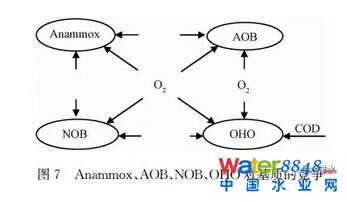 在主流厭氧氨氧化工藝中,主要有Anammox菌、AOB、NOB、普通異養(yǎng)菌(OHO),這些微生物共存于一個(gè)系統(tǒng)中,對(duì)不同的基質(zhì)形成了非常復(fù)雜的競(jìng)爭(zhēng)關(guān)系,主要有AOB與NOB對(duì)氧的競(jìng)爭(zhēng)(DO的控制水平、曝氣的時(shí)間)、NOB與Anammox菌對(duì)亞硝酸鹽氮的競(jìng)爭(zhēng)(不同的亞硝酸鹽氮半飽和濃度及不同的溫度敏感性)以及異養(yǎng)菌與NOB對(duì)亞硝酸鹽氮的競(jìng)爭(zhēng),如圖7所示,如何控制這些微生物處于合理的水平無(wú)論是對(duì)于微生物的認(rèn)知還是控制手段的優(yōu)化都是巨大的挑戰(zhàn)。