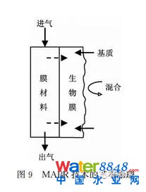 近些年來(lái),在曝氣利用效率方面一項(xiàng)頗具發(fā)展?jié)摿Φ纳锬ぜ夹g(shù)是MABR(Membrane Aerated Biofilm Reactor,即膜曝氣生物膜反應(yīng)器)引起業(yè)內(nèi)的廣為關(guān)注,并被眾多研究者廣為看好。MABR的主要原理是采用空氣在膜絲中進(jìn)入,生物膜附著于膜材料表面上(如圖9所示),曝氣的氧利用效率得到了極大的提高。傳統(tǒng)微孔曝氣技術(shù)的氧轉(zhuǎn)移率通常為1~2 kg O2/k˙Wh,而MABR可以達(dá)到6 kg O2/kW˙h以上,節(jié)能效果非常顯著。