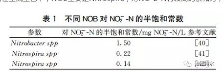 在這些復(fù)雜的競(jìng)爭(zhēng)關(guān)系中,如何抑制NOB成為這一技術(shù)發(fā)展的關(guān)鍵所在,從目前的認(rèn)識(shí)來(lái)看,NOB遠(yuǎn)比我們之前的認(rèn)識(shí)復(fù)雜,抑制的難度也較大。在側(cè)流工藝中,NOB主要是Nitrobacter,對(duì)NO-2-N有較低的親和力。而在主流工藝中,NOB主要是Nitrospira,對(duì)NO-2-N有較高的親和力,如表1所示。