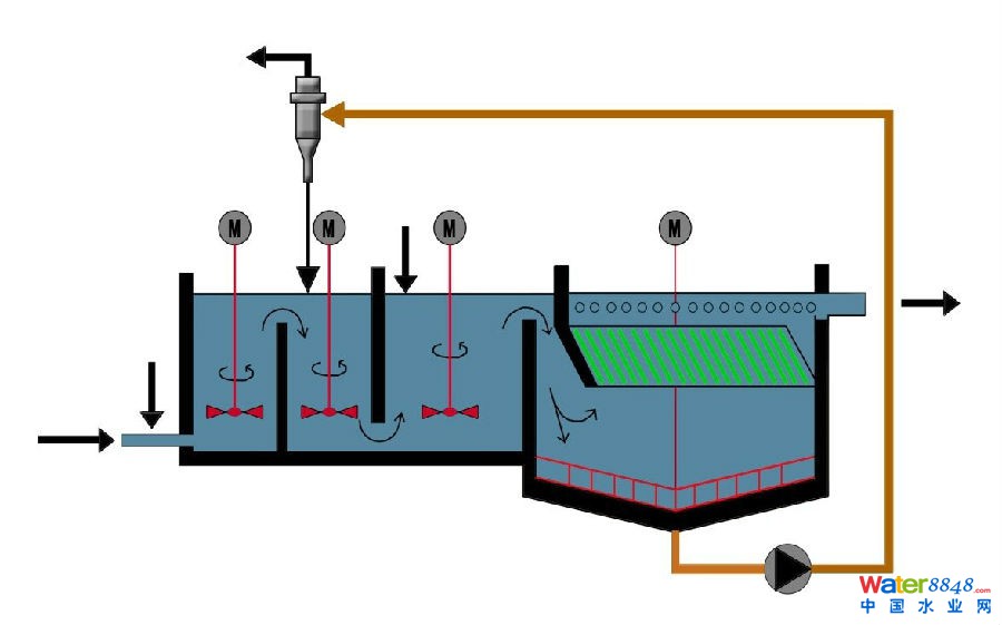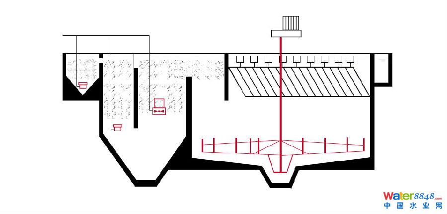 將負(fù)載物加載到形成的礬花上,極快地加速后續(xù)的泥水分離,負(fù)載物通過(guò)旋流分離回收重復(fù)利用。適應(yīng)于占地特別有限的場(chǎng)合,上升流速40-60m/h;除磷;適應(yīng)現(xiàn)有水廠的提質(zhì)擴(kuò)容