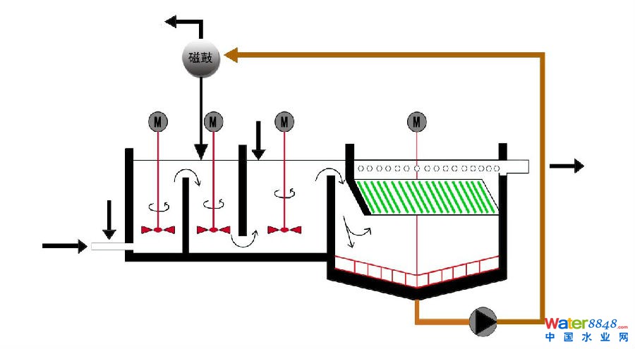 負(fù)載物加載到形成的礬花上,極塊地加速后續(xù)的泥水分離,負(fù)載物通過(guò)磁鼓回收重復(fù)利用。占地非常小,上升流速40-60m/h;除磷;適應(yīng)現(xiàn)有水廠的提質(zhì)擴(kuò)容