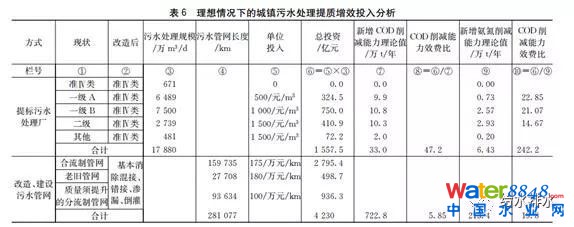 根據(jù)估算結(jié)果,不考慮工程可行性和實施期限的前提下,污水處理廠全面提標(biāo)到準(zhǔn)Ⅳ類,投資需1 557.5億元,折合污染物削減能力費(fèi)效比(提升單位污染物削減能力的投資額)為,COD 33.0億元/(萬t/年),氨氮242.2億元/(萬t/年)。改造污水管網(wǎng)、提升收集效能的總投資是4 230億元,折合成COD削減能力費(fèi)效比是5.85億元/(萬t/年),氨氮19.8億元/(萬t/年)。