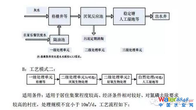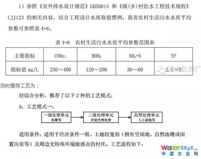 由適用條件不難看出適用于經(jīng)濟條件一般、土地寬裕,言外之意就是模式一“厭氧+人工濕地”可以簡單去除有機物,對氮磷幾乎沒喲去除作用。而模式二,原文已經(jīng)說明適用于“經(jīng)濟條件相對較好、對氮磷去除要求較高的村莊”。
