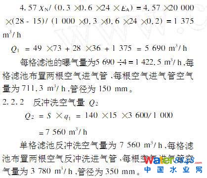 在運(yùn)行周期內(nèi),隨著時(shí)間的延續(xù),濾層中的空隙逐漸被新生長的生物固體和懸浮固體堵塞,濾層水頭損失增加,當(dāng)達(dá)到一定程度(過濾水位升高013~015m)時(shí),需進(jìn)行反沖洗。為保證有效沖洗,必須有合理的配水、配氣系統(tǒng),并保證其均勻性。因此,反沖洗裝置采用大阻力配水系統(tǒng),均勻的配氣系統(tǒng),在承托層中均勻地布置多排穿孔配水管和配氣管。