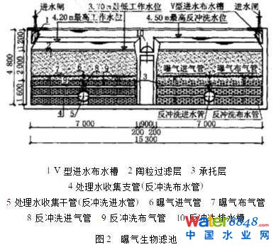 曝氣生物濾池池型結(jié)構(gòu)見圖2。其工藝過程是,經(jīng)初級(jí)處理后的污水進(jìn)入曝氣生物濾池V型進(jìn)水布水槽1,通過V型槽布水孔進(jìn)入生物反應(yīng)過濾區(qū),該區(qū)由生物反應(yīng)過濾層2和承托層3組成。生物反應(yīng)過濾層內(nèi)裝填圓形輕質(zhì)陶粒濾料,這種濾料表面粗糙,容易粘附、生長高濃度生物膜,該膜不受泥齡限制,種類豐富,不同濾層段都能自然形成與本段水質(zhì)相適應(yīng)的優(yōu)勢種類。