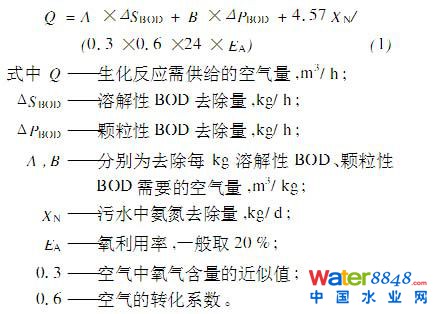 為保證曝氣生物濾池正常運(yùn)行,需供給足夠的空氣量,以滿足生化反應(yīng)所需的氧量。污水中有機(jī)物、懸浮物的去除,氨氮的硝化都是在生物過濾層中進(jìn)行的,所需要的氧量主要包括有機(jī)物的降解和氨氮的硝化。因此,生化反應(yīng)需供給的空氣量可由(1)式計(jì)算: