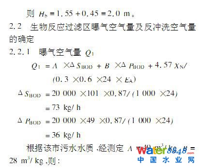 (2)曝氣生物濾池處理城市污水的主要設(shè)計(jì)參數(shù)為:有機(jī)物容積負(fù)荷210~313kgBOD/(m3・d);過濾濾速018~115m/h;水力停留時(shí)間110~210h;生化反應(yīng)曝氣量氣水比為6~9;反沖洗方式中空氣單獨(dú)沖洗3~5min,氣水聯(lián)合反沖洗3~5min,水單獨(dú)沖洗1~3min;空氣反沖洗強(qiáng)度10~20L/(s・m2),水反沖洗強(qiáng)度510~1010L/(s・m2)。