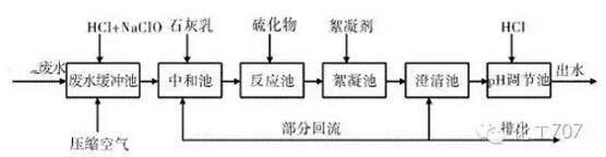 將重金屬廢水pH值調(diào)節(jié)為一定堿性后,再通過向重金屬廢水中投加硫化鈉或硫化鉀等硫化物,或者直接通入硫化氫氣體,使重金屬離子同硫離子反應生成難溶的金屬硫化物沉淀,然后被過濾分離。由于金屬硫化物的溶度積比相應的金屬氫氧化物的溶度積小得多,因此,硫化物沉淀法比氫氧化物沉淀法具有更多的優(yōu)點,比如沉渣量少,容易脫水,沉渣金屬品位高,有利于金屬的回收?墒橇蚧锍恋矸ㄒ灿胁蛔阒,比方說硫化物結晶比較細小,難以沉降,因而應用也不是很廣。