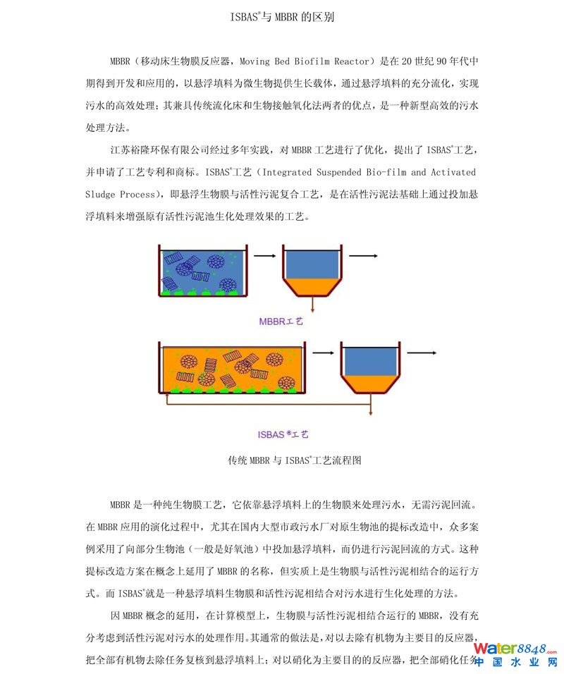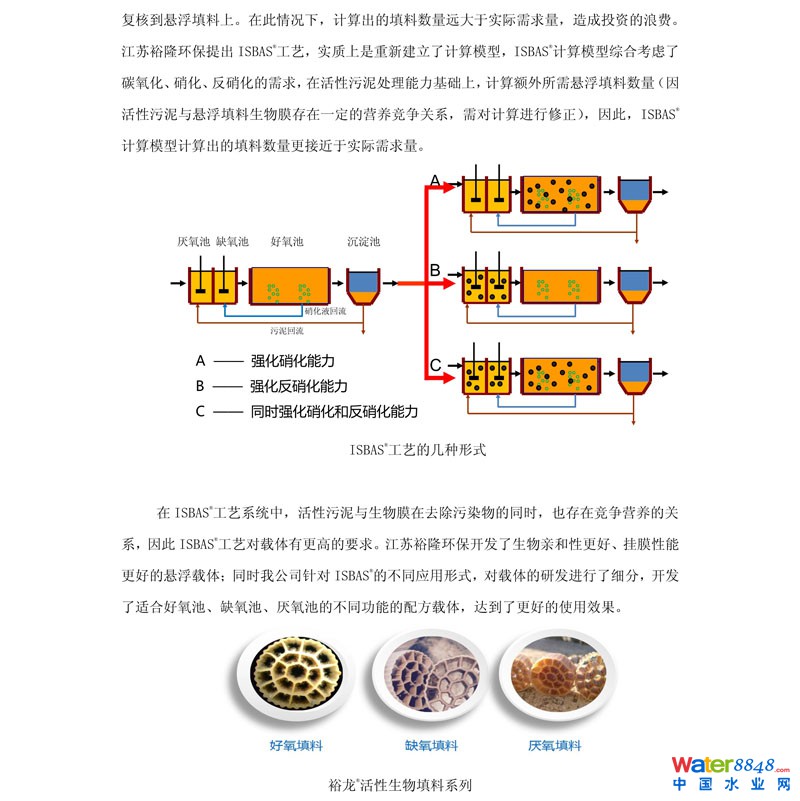 江蘇裕隆環(huán)保有限公司經(jīng)過(guò)多年實(shí)踐,對(duì)MBBR工藝進(jìn)行了優(yōu)化,提出了ISBAS®工藝,并申請(qǐng)了工藝專(zhuān)利和商標(biāo)。ISBAS®工藝(Integrated Suspended Bio-film and Activated Sludge Process),即懸浮生物膜與活性污泥復(fù)合工藝,是在活性污泥法基礎(chǔ)上通過(guò)投加懸浮填料來(lái)增強(qiáng)原有活性污泥池生化處理效果的工藝。