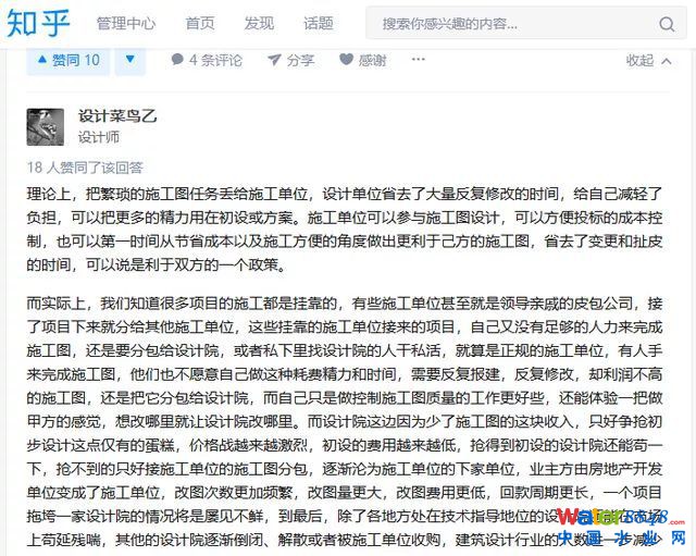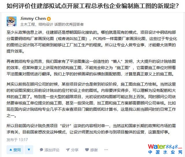 《復(fù)函》的發(fā)布,在業(yè)界牽起了較大的轟動,這改變了我國施工單位和施工圖設(shè)計(jì)單位不是同一家單位的現(xiàn)狀,即以后的工程施工圖不用設(shè)計(jì)院去畫了,施工單位可以自己搞定。試點(diǎn)的實(shí)施,對設(shè)計(jì)院有什么影響?我們來看看網(wǎng)友的看法。