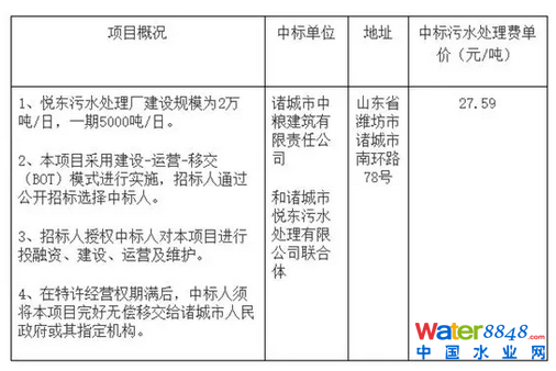 公告顯示,該項(xiàng)目最終花落諸城市中糧建筑有限責(zé)任公司和諸城市悅東污水處理有限公司聯(lián)合體,具體的中標(biāo)結(jié)果如下: