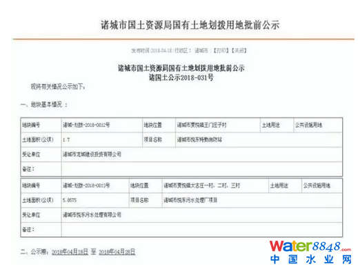 2018年國(guó)土資源部顯示“諸城市國(guó)土資源局國(guó)有土地劃撥用地批前公示”情況,項(xiàng)目名稱為諸城市悅東污水處理廠項(xiàng)目,地塊編號(hào)為諸城-劃撥-2018-0013號(hào),地塊位置于諸城市賈悅鎮(zhèn)太古莊一村、二村、三村。土地用途為公共設(shè)施用地,土地面積5.8575(公頃),受讓單位為諸城市悅東污水處理有限公司。