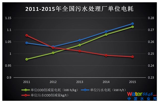 2011-2015年全國污水處理廠單位電耗。資料來源:中國人民大學低碳水環(huán)境技術(shù)研究中心