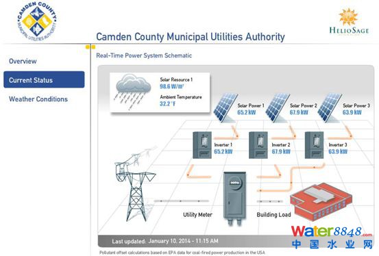 2012年7月,CCMUA太陽能中心啟用了一個(gè)1.8兆瓦的太陽能光伏發(fā)電系統(tǒng),該系統(tǒng)由7200多塊太陽能電池板組成,覆蓋7英畝大小的開放池。設(shè)計(jì)的創(chuàng)新之處在于8-9英尺高的天篷系統(tǒng)的安裝,不會(huì)干擾其他設(shè)備池的使用,操作或維護(hù)。太陽能光伏結(jié)構(gòu)是防腐(鹽水、碳酸和硫化氫)設(shè)計(jì),由Schletter(一家知名的光電托架系統(tǒng)供應(yīng)商,包括車棚)制造的改裝車棚天篷。根據(jù)PPA,CCMUA無資本支出,也不負(fù)責(zé)任何運(yùn)營和維護(hù)成本。 CCMUA唯一的財(cái)務(wù)責(zé)任是每月支付固定價(jià)格且為期15年的太陽能電費(fèi)。 CCMUA估計(jì)將節(jié)省數(shù)百萬美元的能源成本。據(jù)估計(jì),太陽能光伏系統(tǒng)每年將產(chǎn)生大約220萬千瓦時(shí)(度)的電力,并且基于CCMUA互動(dòng)網(wǎng)站的預(yù)測表現(xiàn)會(huì)更好。該網(wǎng)站顯示當(dāng)前和累積的能源產(chǎn)量以及環(huán)境屬性,并實(shí)時(shí)反映當(dāng)前的能源生產(chǎn)情況,如下圖所示。