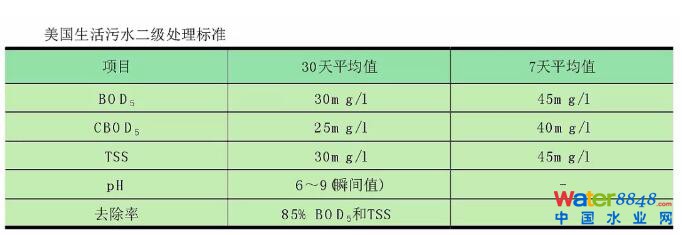 根據(jù)1972年《清潔水法》301條規(guī)定,美國的生活污水處理設(shè)施在1977年6月1日前全部執(zhí)行二級處理標準;若水體中含有氮元素,生化處理過程中發(fā)生硝化反應(yīng),BOD5指標不能準確反映出水水質(zhì)情況時,用CBOD5取代BOD5指標。若出水排入地表水,受納水體不能達到水質(zhì)標準,就要達到更為嚴格的基于水質(zhì)的排放限值;如果受納水體列入《清潔水法》303(d)條款中的受損水體清單,排放限值則需根據(jù)最大日負荷總量計劃分配日允許排放負荷,制定排放限值。