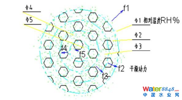 物料內(nèi)部水份必須通過熱能形成具有一定壓力的蒸汽克服遷移路徑(R)的阻力(f)才能排出顆粒表面以外,熱能(Q)是通過物料之間的傳導(dǎo),其需要傳遞的時間和過剩能量, 有一個重要的因素就是其傳導(dǎo)路徑(R)的長短;