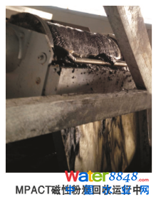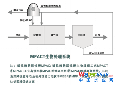 為解決活性炭排泥流失,投加帶有磁性的粉狀活性炭,在排出剩余污泥時(shí)先經(jīng)過(guò)磁性粉炭污泥分離器將帶磁的粉末活性炭回收并回到原生化系統(tǒng)循環(huán)使用,這就是在杜邦PACT法基礎(chǔ)上再創(chuàng)新開(kāi)發(fā)并享有專利的MPACT磁性粉末活性炭生物處理工藝。