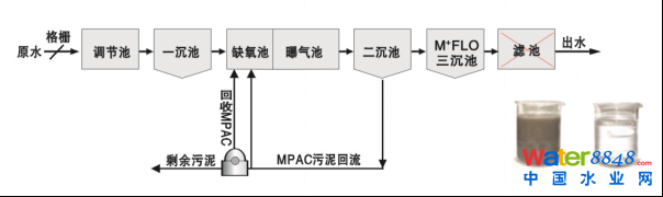 ■活性污泥濃度是常規(guī)法的5~10倍,容積負(fù)荷高,COD降解去除率大幅提高(10%~40%),剩余污泥大幅減量(只有微量或少量),HRT停留時(shí)間短,MPAC活性污泥沉降性能好,生化池大幅縮小,其二沉池出水后接M+FLO沉淀池深度凈水系統(tǒng),市政污水出水CODcr<20~30mg/L,氨氮<1mg/L,TP<0.05mg/L,對(duì)于高濃度工業(yè)廢水其出水同樣可優(yōu)于一級(jí)A排放標(biāo)準(zhǔn)。系統(tǒng)占地小(節(jié)省60%~70%),投資省。