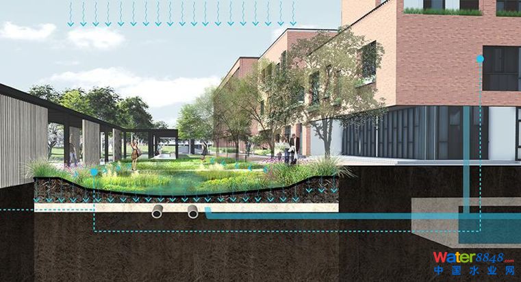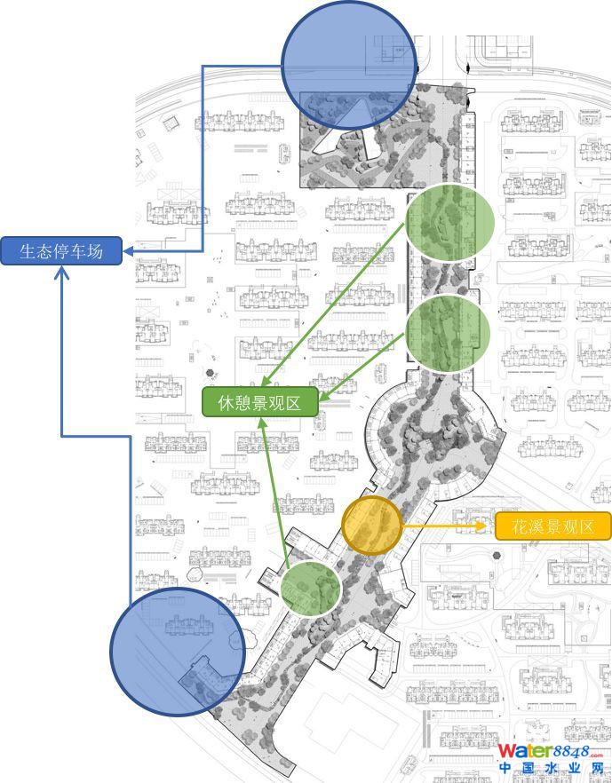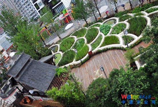 除了利用陶土磚的透水性鋪裝園路,還建造一條旱溪,配合植物營造溪水景觀,達(dá)到晴天景觀,雨天存水,旱溪可與雨水管渠聯(lián)合應(yīng)用。