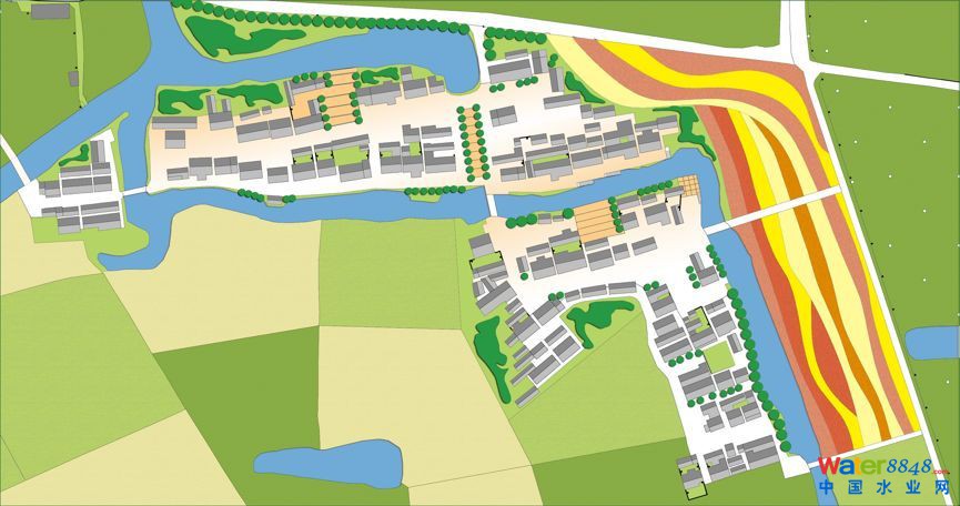 龍耀路以北景觀設(shè)計(jì)主要以樹林、草坪、廣場(chǎng)、花園相結(jié)合,使“水系和綠地穿插,汽車、自行車、人與河流并行不悖”。