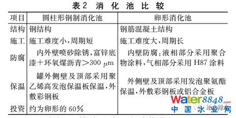 國(guó)內(nèi)大中型污泥處理中采用的消化池外形多為圓柱形、卵形等,高安屯污泥處理中心設(shè)計(jì)采用圓柱形鋼制消化池,與傳統(tǒng)卵形消化池的比較(以本設(shè)計(jì)單池有效容積為基準(zhǔn))見(jiàn)表2。