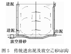 傳統(tǒng)圓柱形消化池一般采取上下進(jìn)泥、底下出泥,中部下端低洼部分為放空排砂的方式(如圖5所示),這種方式,整個(gè)池內(nèi)液體混合較好,無(wú)死區(qū),但排砂效果不理想。