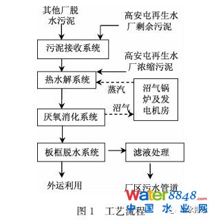 外廠污泥(約1700t/d)送至污泥處理中心,與高安屯再生水廠的部分剩余污泥混合漿化,含水率調(diào)制85%左右進(jìn)入熱水解系統(tǒng),出泥經(jīng)稀釋和冷卻,達(dá)到含水率90%~92%和溫度53℃左右,進(jìn)入?yún)捬跸剡M(jìn)行消化,消化后的污泥脫水到含水率60%以下外運(yùn)。脫水濾液收集處理后排入廠區(qū)污水管道。產(chǎn)生的沼氣經(jīng)脫硫處理送至沼氣鍋爐發(fā)電機(jī)房,鍋爐燃燒沼氣產(chǎn)生的蒸汽供熱水解使用,其余沼氣可用于發(fā)電。