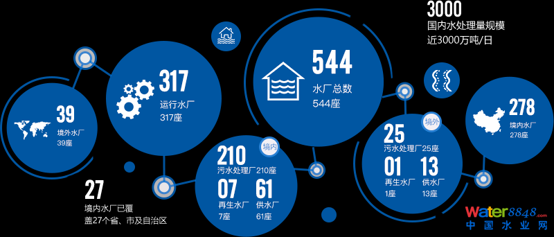 2017年,北控水務實現(xiàn)年營業(yè)收入超211億港元,同比增長22%,實現(xiàn)歸屬母公司凈利潤超37億港元,同比增長15%。截至2017年12月31日,北控水務總資產(chǎn)超1004億港元,在全國及海外擁有782座水廠(含污水處理廠、自來水廠、再生水處理廠及海水淡化廠)。