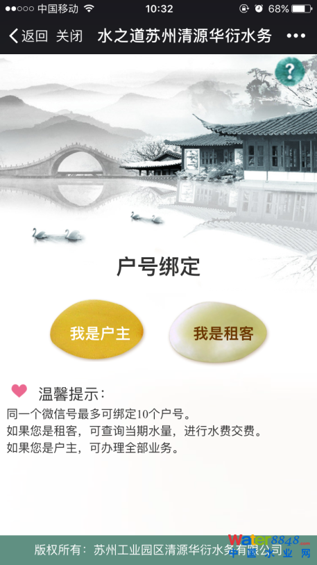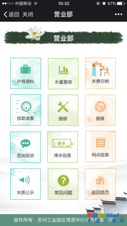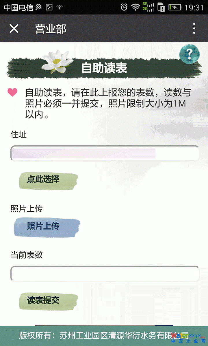 用戶(hù)關(guān)注 “水之道蘇州清源華衍水務(wù)”官方微信號(hào),成功綁定戶(hù)號(hào)后可在指定時(shí)間內(nèi)將水表的讀數(shù)拍照上傳,輸入相關(guān)數(shù)據(jù),完成抄表。