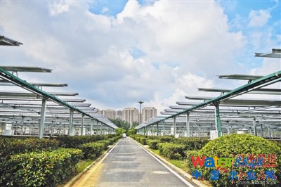 晨報訊 近日,王小郢污水處理廠分布式光伏發(fā)電項目正式建成并網(wǎng)發(fā)電。8月22日,江淮晨報、江淮網(wǎng)記者從合肥市城鄉(xiāng)建委獲悉,這是全省首家、國內(nèi)并網(wǎng)規(guī)模最大的污水處理廠分布式光伏電站項目。每年可提供約1200萬度綠色清潔電能,相當(dāng)于每年節(jié)約標(biāo)準(zhǔn)煤3936噸。 22日下午,位于銅陵南路的王小郢污水處理廠內(nèi),整齊排列的太陽能光伏板反射出的光格外耀眼。污水處理廠有著大面積的水處理水池,該項目通過在污水處理廠的氧化溝和沉淀池上方空間布排光伏組件,實現(xiàn)了空間資源的綜合有效利用。 合肥市城鄉(xiāng)建委排管辦項目管理科科長袁良松介紹,該項目占用空間面積約11萬平方米,并網(wǎng)電壓等級為10kV,項目分兩個并網(wǎng)點接至廠區(qū)內(nèi)10kV配電室。每年可提供約1200萬度綠色清潔電能,相當(dāng)于每年節(jié)約標(biāo)準(zhǔn)煤3936噸,減排二氧化碳11965噸,降低碳粉塵排放3264噸。所發(fā)電能采用“自發(fā)自用、余電上網(wǎng)”模式,其中90%以上可被污水處理廠就地消納。 目前,王小郢污水處理廠每天處理污水基本都是用工業(yè)電。今后,因享受電價優(yōu)惠政策,每年可節(jié)省電費支出70萬元以上。在源源不斷地輸送“綠色”電力的同時,還有效實現(xiàn)了土地及空間資源的二次開發(fā)利用。 袁良松表示,在污水處理廠建設(shè)分布式光伏發(fā)電站項目,在外地有些城市已有嘗試。而在我省,這還是第一次。此次光伏發(fā)電項目的建成,一躍成為國內(nèi)迄今為止并網(wǎng)規(guī)模最大的污水處理廠分布式光伏電站項目。 來源 : 晨報首席記者 方佳偉/文 晨報記者 李福凱/攝 實習(xí)生 王琪 顏淥璐 |